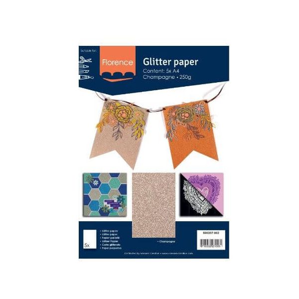 Carta glitterata A4 5fogli 250g Champagne - Vaessen Con i fogli di cartoncino glitterati Florence, puoi aggiungere facilmente dei bei dettagli glitterati ai tuoi progetti artigianali. Crea biglietti di Natale scintillanti, biglietti di compleanno abbaglianti e inviti glamour. Decora un planner o una pagina di scrapbook con abbellimenti glitter fustellati o crea graziose decorazioni per le feste e la tua casa.