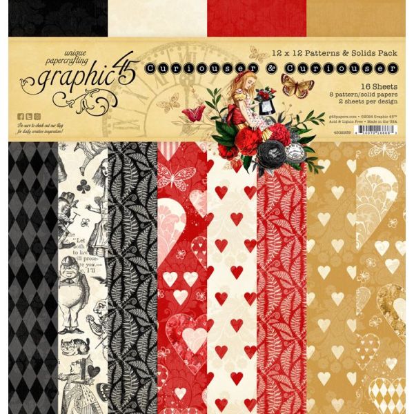 Curiouser & Curiouser - G45 Paper Collection. Introducing Graphic 45's enchanting Curiouser & Curiouser Paper Collection - a whimsical journey into the world of fantasy and imagination. Inspired by classic tales of curiosity, this collection is filled with vibrant illustrations of iconic characters like Alice and the White Rabbit, alongside rich floral elements, vintage playing cards, and intricate butterflies. With bold reds, blacks, and golds, this collection is an ideal choice for creating romantic Valentine's cards, heartfelt gifts, or even vintage-inspired home décor. Whether your customers are seasoned crafters or just starting out, this collection will inspire countless Alice in Wonderland-themed creations.