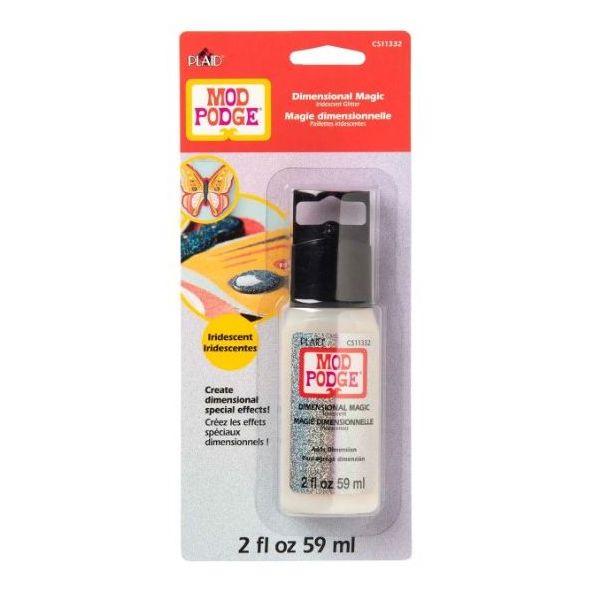 Mod Podge Dimensional Magic, a differenza della maggior parte delle formule Mod Podge, non è un medium di decoupage, ma un prodotto acrilico. Pertanto, non si applica con un pennello. Dimensional Magic è molto facile da applicare direttamente dal flacone grazie alla bottiglia squeeze e al pratico beccuccio per versare. Mod Podge Dimensional Magic è disponibile sia completamente trasparente che con glitter oro, argento e iridescenti.