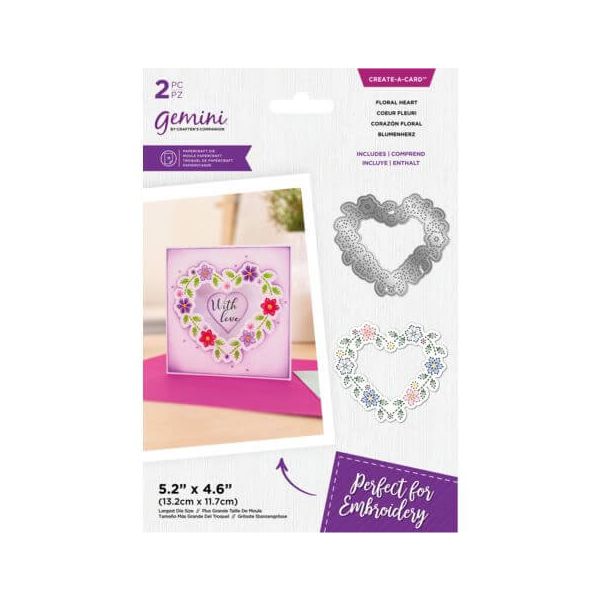 Stitch with love to craft extra-special keepsake cards with Gemini Embroidery Frame Dies! This collection combines the elegant art of embroidery with delicate die-cutting and papercraft to create cards with hand-stitched designs. Whether youve never picked up a needle before or youre a keen sewist, with this range all abilities can create embroidery designs with ease. Each set includes dies to cut out a beautiful, nature-inspired design with a ready-made stitching guide! Simply follow the pre-cut holes with your needle and thread to sew showstopping handmade cards. The Floral Heart set includes two metal dies to create a heart-shaped frame filled with sweet and dainty flowers. The central aperture follows the natural line of the floral design, to create a cheerful and setting for a sweet sentiment or message. Use the dies to cut directly into the front of a card, or cut the frame out to turn it into an embroidered topper or home decor piece. All you need is a die-cutting machine, simply create your plate combination using the helpful Sandwich Guide in the instruction manual and run it through your die-cutting machine.* Each set comes with full instructions, including a diagram showing which colours to use to recreate our autumnal design. And, with 12 shades to choose from, the Crafters Companion Embroidery Thread Pack has all the shades featured in this collection. So, you can craft along with us or go wild and choose your own shades to create something to suit the season, event or just your own personal style. Check out the full Gemini Embroidery Frame Dies collection to start stitching handmade cards to delight friends and family all year round. *We recommend using an electronic Gemini Die-cutting machine with this range.