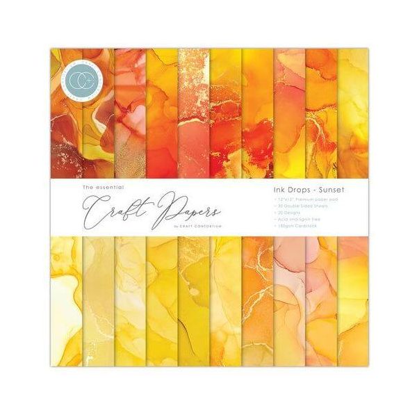 Ink Drops - Sunset, is the 24th theme in our evergreen range; 'The Essential Craft Papers'. Themed on the patination of alcohol inks in bold tones of yellow and orange through to hints of burning red, this exquisite new collection will add impact to your makes, with strong tonal hues and statements of bold colour. Perfect for crafting whether card making, scrapbooking, weddings and occasions. 12x12 inch Premium Paper Pad, 30 Sheets, 20 Double Sided Designs, 180gsm, acid & lignin free.