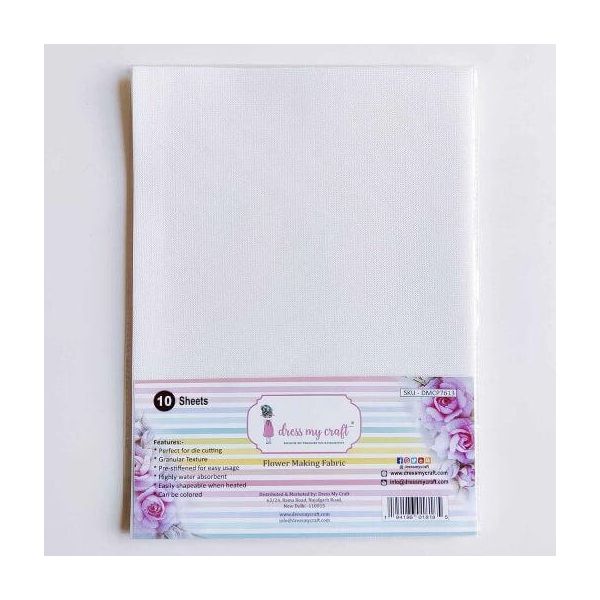 Dress My Craft. Flower Making Fabric Size Approx A4 (8.5 inch x 11 inch). Pack of 10 Fabric Sheets. A versatile and easy-to-use fabric sheets for your flower-making projects. These fabric sheets contain a granular texture that adds a touch of elegance to any flower. One of the standout features of these sheets is that its a pre-stiffened fabric. This means that the fabric is already stiffened, making it easier to mould and shape into your desired flower design. Its a pre-stiffened fabric so you dont have to spend extra time or effort trying to stiffen the fabric yourself, which can be a tedious and time-consuming process. Fabric sheets are very easy to use for die cutting. You can use a variety of dies to create different sizes and shapes of flowers, giving you the freedom to experiment and create unique designs. These sheets are highly water absorbent. This is essential for keeping your flowers hydrated and looking fresh.
