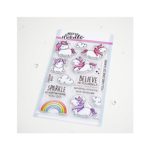 4x6 inch Clear Photopolymer Stamp Set. These Fluffy Puffy Unicorns really are one of a kind with their sweet, chubby bellies and happy faces! A set of 15 stamps including 5 podgy unicorns, 3 whimsical cloud images, a rainbow, a collection of sparkles and 5 sentiment stamps.