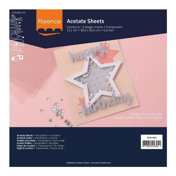 I fogli di acetato (noti anche come fogli di mica o pergamena di mica) sono incredibilmente versatili. Che si tratti di timbrare, goffrare o creare uno sfondo inchiostrato per hobby come la creazione di biglietti o lo scrapbooking, questi fogli rappresentano la base trasparente ideale per i tuoi progetti creativi. I fogli di acetato di Vaessen Creative sono realizzati in plastica resistente e flessibile. Spessore di 0,2 mm.