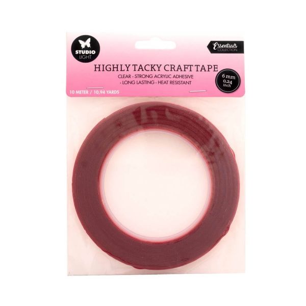 Essentials by Studio Light. Highly tacky craft tape. Clear, strong acrylic doublesided adhesive, long lasting, heat resistant. Always clean the surface of jointing objects before using. Acid & lignin free. 165x130x6mm/0,24 inch. 10 meter / 10.94 yards.
