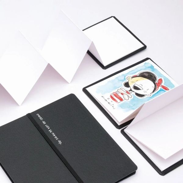 Il album per schizzi ha una carta bianca lucida per acquerelli (300 gsm) con una consistenza liscia, che la rende adatta a tutti i tipi di tecniche di pittura ad acquerello con pennello o penna. Il album per schizzi Leporello di Paperfuel è disponibile in tre misure: 10 x 10 cm, 10 x 15 cm e 17 x 17 cm. L'album ha una robusta copertina nera opaca con una divertente citazione ("To draw or not to draw") e il logo Paperfuel. L'album per schizzi può essere chiuso con l'elastico nero.