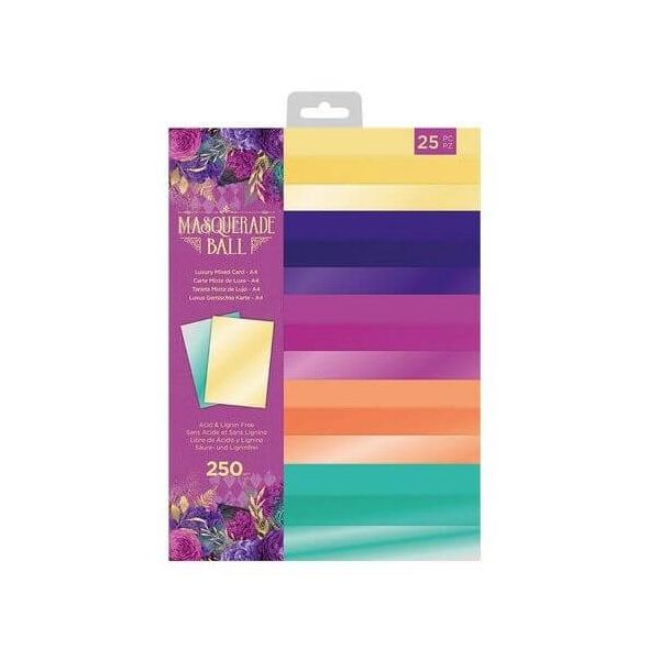 You and your papercraft creations are invited to the most opulent event of the year - the Masquerade Ball! This opulent collection is unashamedly bright, bold and spectacular. Filled to the brim with peacock feathers, butterflies, bling and of course ornate masks, the Masquerade Ball Collection channels the harlequin designs and sumptuous stylings of the classic Venetian masquerade. Perfect for crafting party invitations that no-one could turn down, or celebration cards for those extra special occasions. The Luxury Mixed Card box is a kaleidoscope of colours and effects! Each box includes 25 sheets of A4 card in five vibrant shades including violet, pink, orange, yellow and turquoise. You will receive five 250gsm sheets of each colour, one sheet of mirror card, 2 sheets of matt mirror card and 2 sheets of pearl card. So theres everything you need to add a touch of luxury to your cards, invitations, table favours, bunting, decorations and so much more! With sets that work together to create your own magnificent mask, luxury card in kaleidoscopic colours, intricately sculpted embossing folders and a dazzling patterned paper pad - theres everything you need to bring all the elegance and opulence of the ball to all of your craft projects.