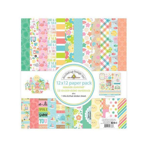 Seaside Summer 12x12 Inch Paper Pack Doodlebug design Questa collezione è perfetta per catturare tutti i tuoi ricordi estivi al mare! Confezioni carta 12x12. Fogli fronte-retro da 12 x 12 pollici. Cartoncino premium. senza acidi/senza lignina. 12 fogli per confezione + un foglio di adesivi