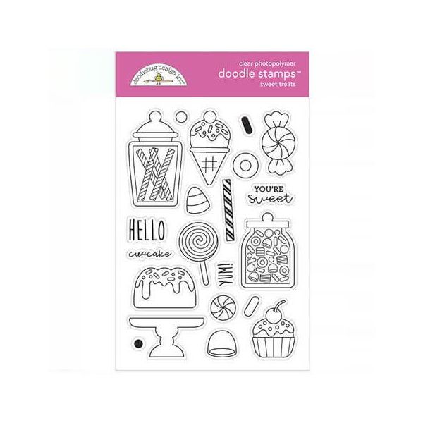 Add some sweet treats to your Halloween cards or party invites with these clear photopolymer stamps from the Ghost Town Collection by Doodlebug Design. The package includes 21 clear stamps on a 4" x 6" storage sheet. The stamps are in the shapes of an ice cream cone, candy, a cake, a cupcake, a lollipop, and more. The stamps can be used with an acrylic block and your favorite inks (sold separately). Made in the USA.