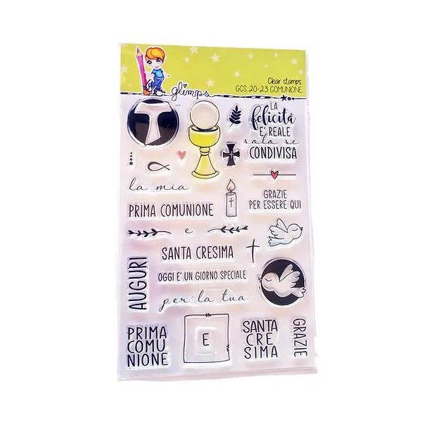 I set Clear Stamps Glimps sono realizzati con fotomolimero trasparente di alta qualità. Semplici da usare, basta rimuovere il timbro dal supporto trasparente e posizionarlo su un blocco di acrilico o un altra base liscia in plexiglass. Dim: A6 - 4''x 6'' Set composto da 28 timbri