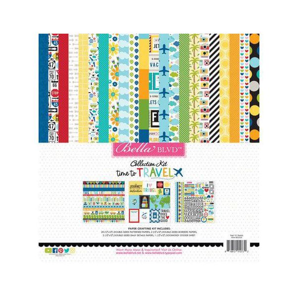 Time To Travel 12x12 Inch Collection Kit This 12" x 12" collection kit is from Bella Blvd and is part of the Time To Travel Collection. This kit contains 20 double sided, textured 12" x 12" papers, two double sided borders papers, two double sided daily details papers which are the papers with card elements, and one 12" x 12" Doohickey sticker sheet. These are all the single papers sold in this collection in one large kit. There are a variety of patterns, colors, and images used throughout the entire collection that coordinate with one another. The sheet of stickers has border pieces, alphabet and number stickers along with punctuation marks, photo corners, words and phrases, tags, hearts, banners, and much more. These papers and stickers can be used for cards, slimline cards, scrapbook pages, tags, journals, planners, and other paper crafting and mixed media projects. These papers and the sheet of stickers are made in the USA.